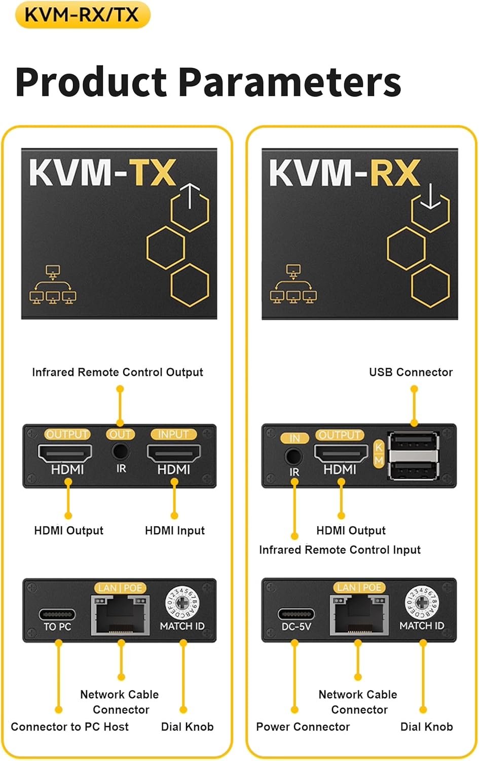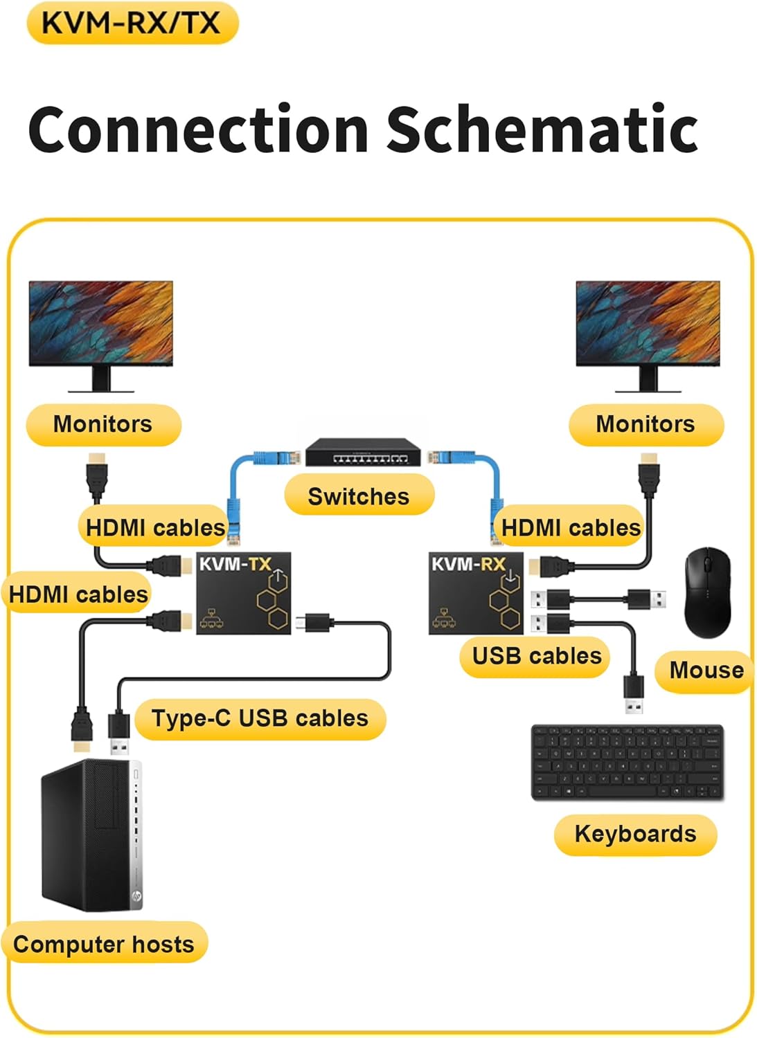 Product Description:The youyeetoo HDMI KVM Extender is a professional-grade solution designed to extend HDMI signals and USB keyboard-mouse control over long distances using a single Cat5e/Cat6 Ethernet cable. Ideal for conference rooms, classrooms, monitoring centers, and other multi-screen applications, this extender provides reliable performance and flexible installation options. Key Features:Long-Distance TransmissionOne Transmitter to Multiple ReceiversKVM & IR Remote ControlFlexible Power OptionsCompact & Easy InstallationWide Compatibility Specifications:HDMI Compliance: HDMI 1.4b, HDCP 1.4Supported Resolutions: Up to 4K P30Transmission Distance: Up to 150 meters (492 feet) via Cat5e/Cat6Power Supply: USB Type-C (5V/1A) or POEDimensions: 60mm × 69mm × 20mmWeight: Approx. 92g (TX), 95g (RX) Support:Support#youyeetoo.com (# >>>@)Forum: Forum.Youyeetoo.com (recommend)Communication and individual advice:am2#youyeetoo.com (# >>>@)