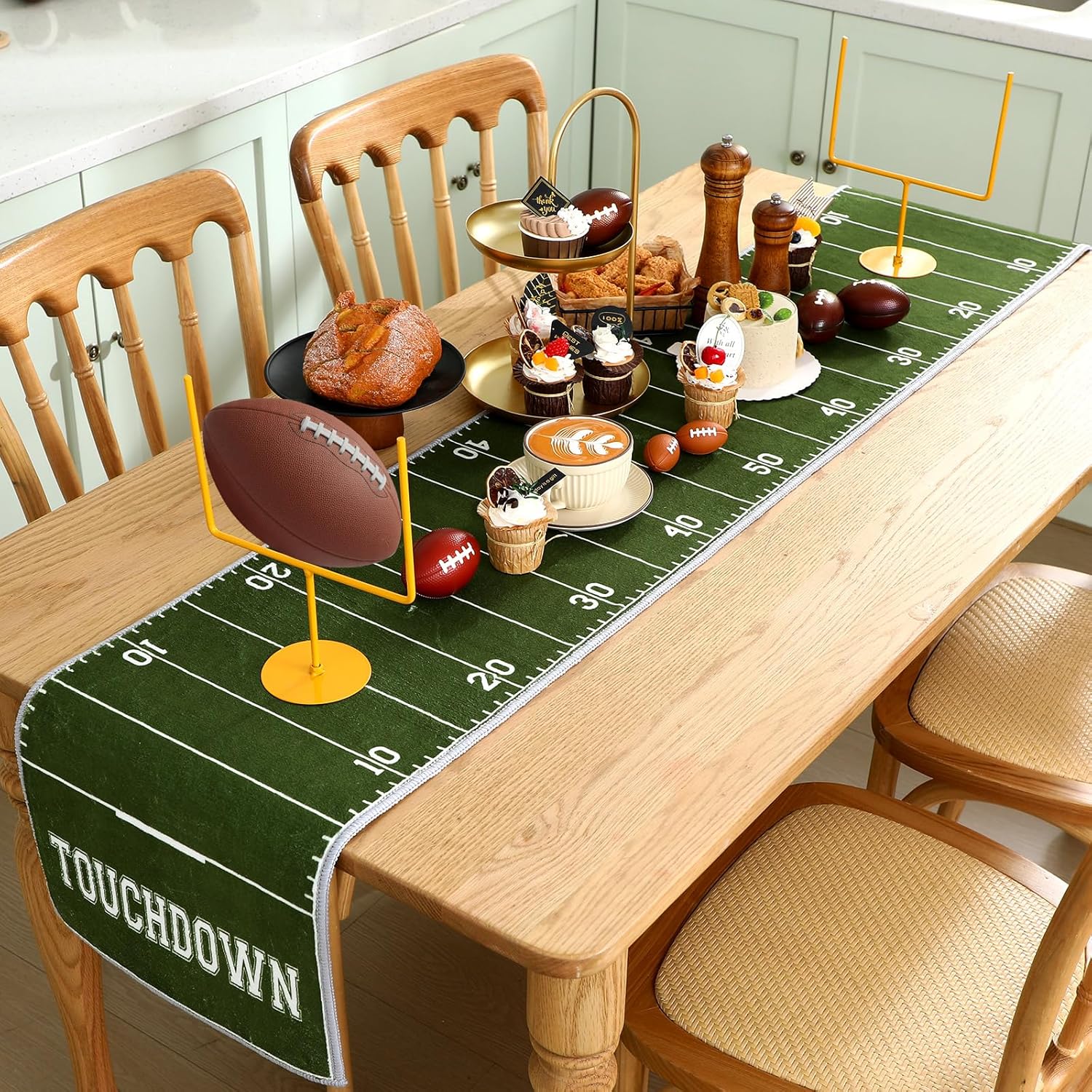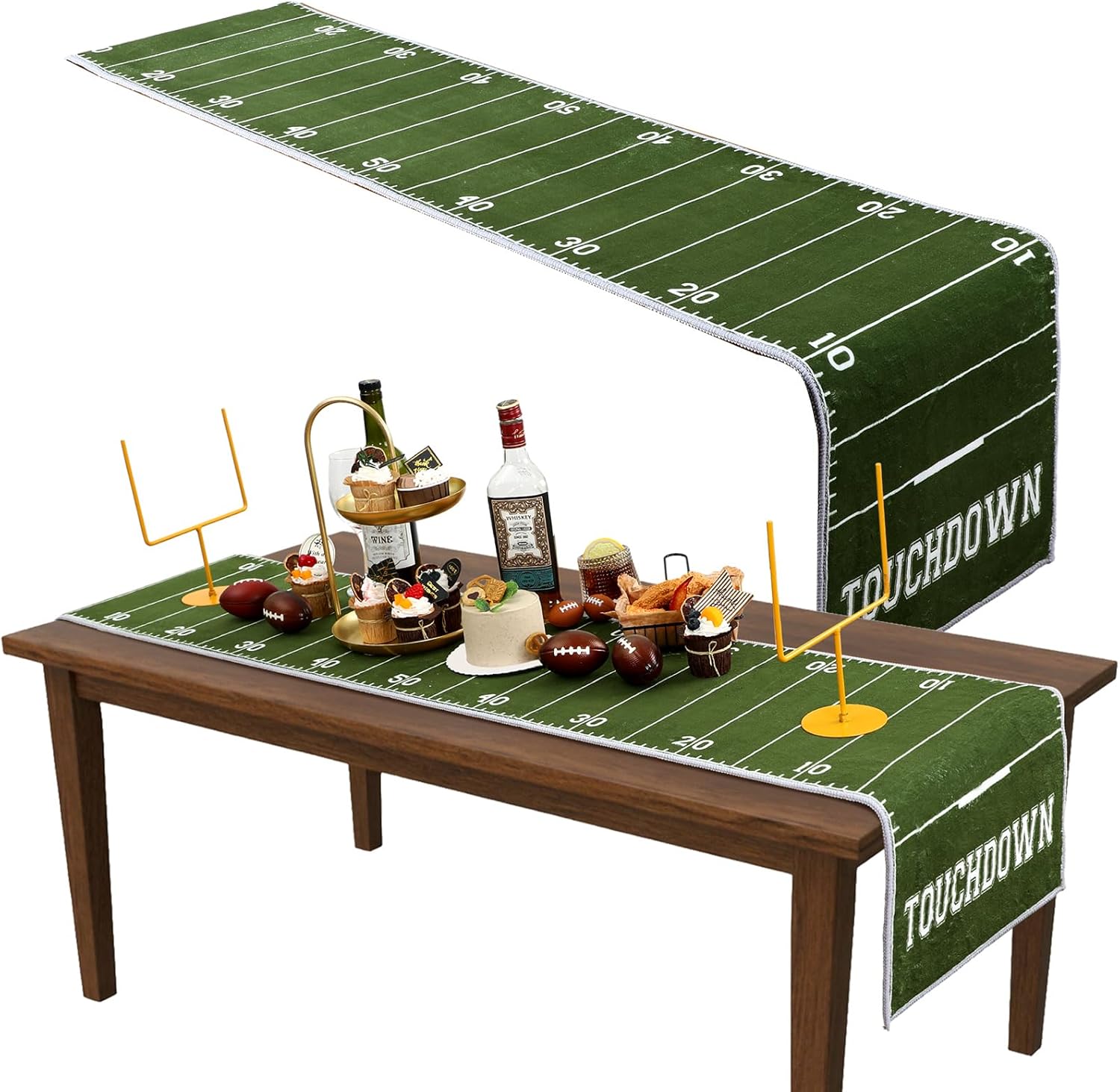 Features: Realistic Football Field Design: the football table runner centerpieces decor with clear yard lines and bold “TOUCHDOWN” lettering, can recreates a mini stadium on your table. Combined with gold football goal post, they delivers a vivid, lifelike game-day experience that instantly draws attention. Coordinated 3-Piece Set: this complete football table decor set includes 2 metal goalposts and 1 American football table runner, designed to work together seamlessly. The contrasting textures of grass and metallic gold create a striking, photo-worthy centerpiece for any sports celebration. Specifications: Material: Imitation cashmere material, metal Color: green, gold Size: rugby birthday party table runner: 13 x 72 inch Football party goal post decoration: 9.8 x 8.1 inches Package includes: 1x Touch down football table runner 2x Football goal posts Notes: Manual measurement, please allow slight errors on size. The color may exist a slight difference due to different screen displays